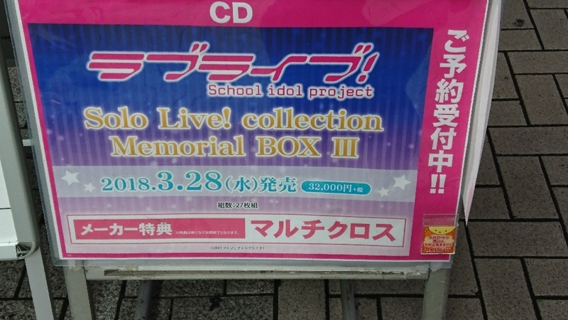2017-11-04 高けええ!!! ラブライブ! 来年の3月に発売されるラブライブの「Solo Live! collection Memorial BoxⅢ」の予約受付中で、 μ‘sの曲が全部入ってるのかな?27枚組で値段が3万2千円(税別)でというまた高い買い物ですが、 予約したライバーなんているのかな?