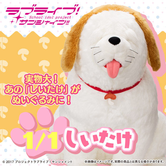2017-11-30 しいたけ 実物大ぬいぐるみ ラブライブ!サンシャイン!! ちかっちの愛犬しいたけの実物大ぬいぐるみが今日から受注開始されます。 定価が2万5千円で送料が約5千円で約3万円で高い買い物ですが、個人的にはゲーセンの景品として出してほしかったです。