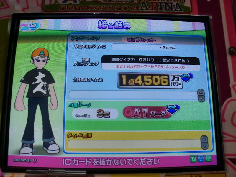 2012-01-28 積み重ねチャレンジに挑戦!&連想地獄 アンサー×アンサー 積み重ねチャレンジに挑戦しましたが、逆転Rが毎回毎回連想だったので、連想が苦手な自分にとって生き地獄でした。積み重ねも必ず答えを間違えてしまい、0ptのまま終わってしまった事もありました。スランプ地獄に陥り、そして、再び見たくなかったこの画面・・・。 「何だこの屈辱的な状況は!!」と言いたくなるほど愚痴りました。ゆきだるまのトシさんの気持ちがよく分かります。自分も10連続予選落ちした経験したよりマシだと思いながら、4クレでSに返り咲きして帰宅しました。
