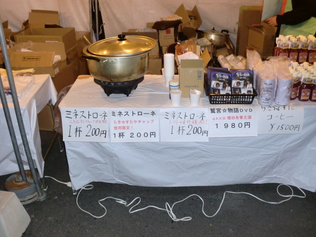 2013-01-16 鷲宮神社での初詣2012~2013 その3 らき☆すた ローソンを後にして、鷲宮神社へ向かいました。 神社の駐車場には、いろんな夜店がありました。 そして、キャラアニブースでラッキーくじはもちろん、 「らき☆すた≒おん☆すて」(以下、らき☆すて)のグッズが販売されていました。 ラッキーくじは、そんなに並んでなかったため、10分ぐらいでくじを引いて 10回引きましたが、かがみやつかさのフィギュアをゲットできませんでした。 その頃、神社の前にある茶屋、大酉茶屋で「ラジオ鷲宮」というラジオ番組で らき☆すてのキャスト、こなた役の酒井蘭さんと、かがみ役の櫻井ゆりのさんが 生トークしていました。 聴いていたファン達はかなり興奮していましたね。 この後、お二人はローソンで握手会へ直行しました。 因みに私も握手会の抽選券をもらえましたが、結果は外れました その4につづく